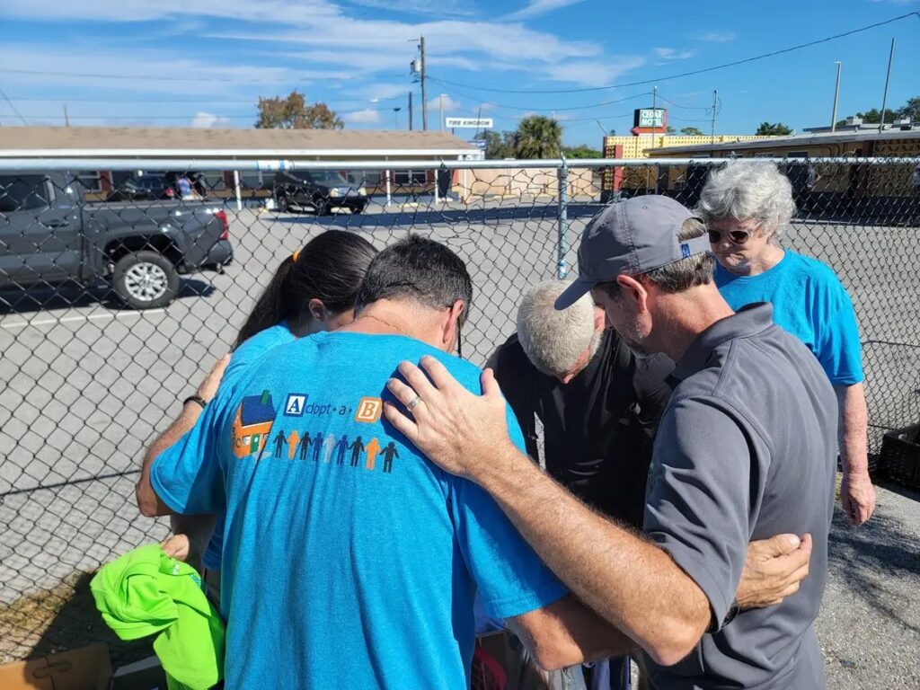 Volunteers prayed together during food drive at the Florida Dream Center. (Photo courtesy of Tara Howett)