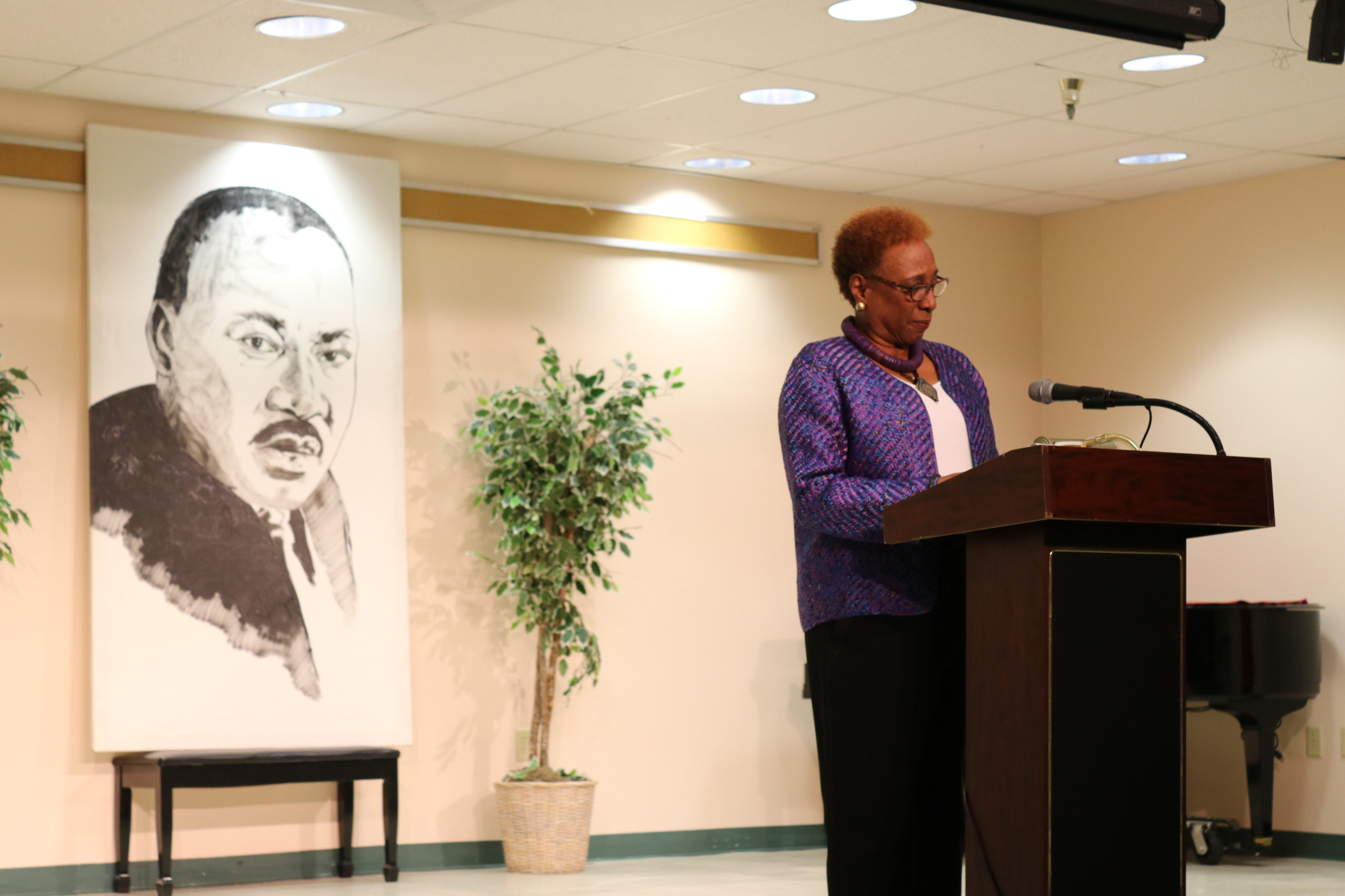 At the 32nd Annual MLK Essay Contest, Virginia Scott, President of the St. Petersburg Martin Luther King Jr. Commemorative Organization Inc., spoke to the attendees about the history of the event.