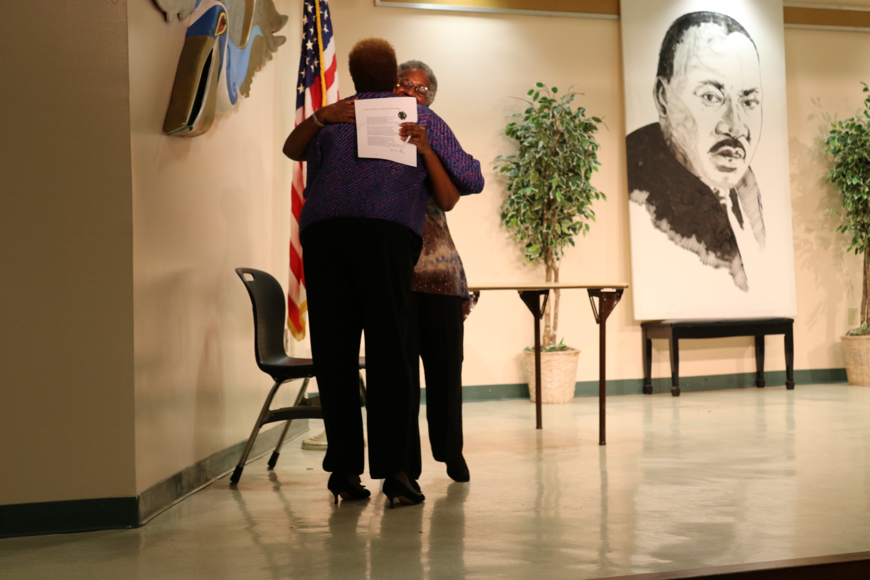 Tyna Middleton, the Enoch Davis Center Senior Advisory Council Secretary, and Virginia Scott shared a hug before Scott gave the event history. Scott is the president of the St. Petersburg Dr. Martin Luther King Jr. Commemorative Organization, Inc. She has been part of the organization since this event began 32 years ago.