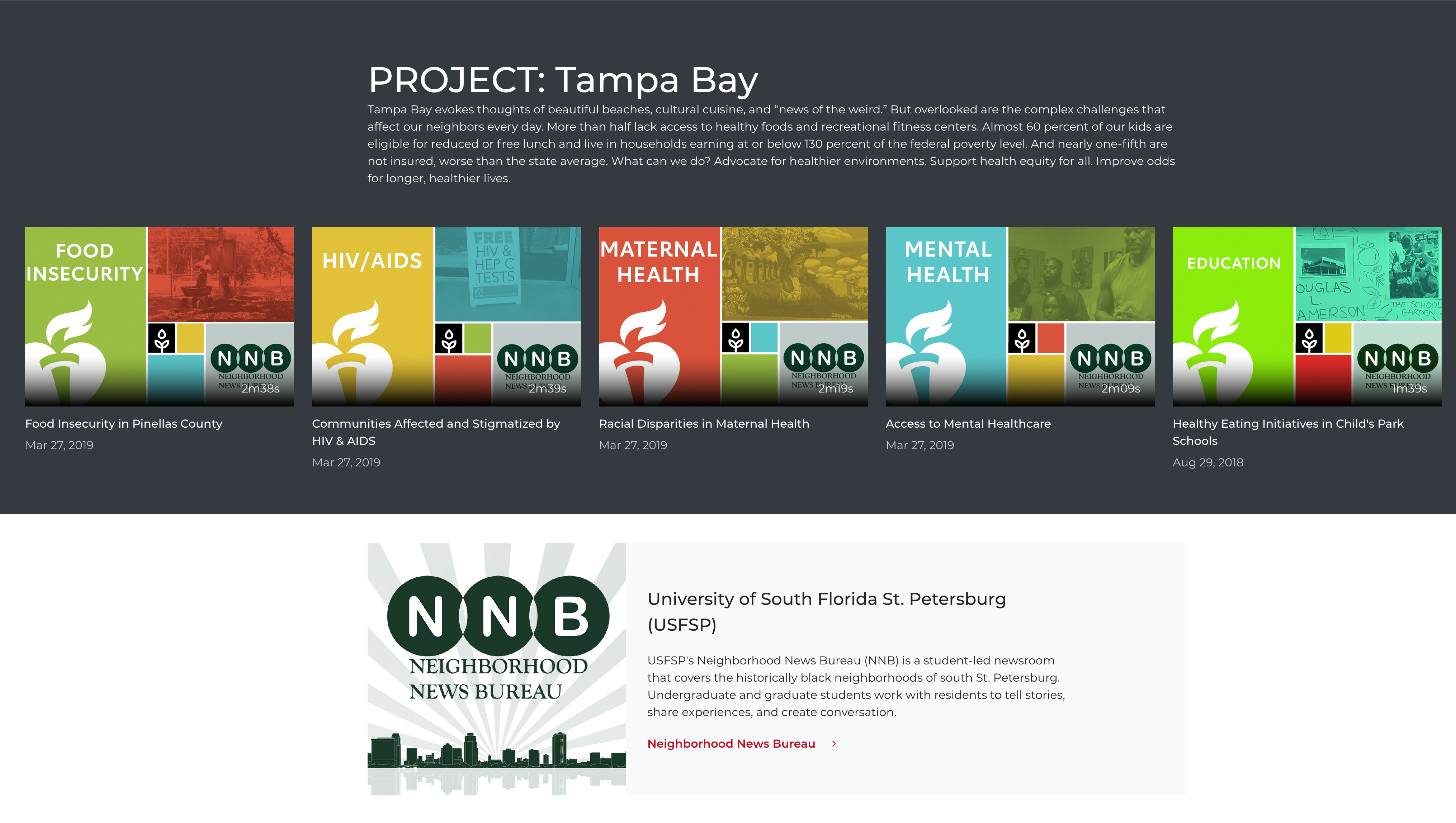 USF St. Petersburg Campus Neighborhood News Bureau A more inclusive conversation in community journalism Current NNB Special Projects NNB Local Black History Project Project: Tampa Bay with the American Heart Association More Special Projects
